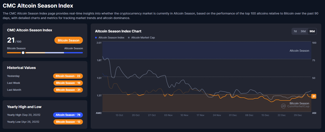 Image 3: The CMC Altcoin Season Index holds at 21/100, keeping the market firmly in Bitcoin Season, yet momentum shows early improvement. Recent readings print 22 yesterday, 19 last week, and 21 last month. The yearly altcoin peak reached 78 during September 2025, while Bitcoin dominance bottomed at 12 in April. Capital still concentrates around Bitcoin, but conditions now allow room for rotation if flows expand.