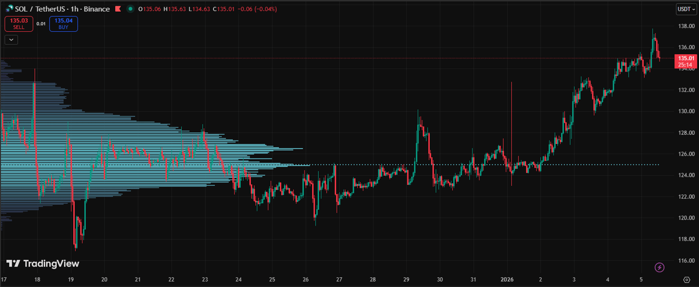 Solana trades at $135.01 on the 1-hour chart, down 0.04%, pausing after a sharp impulse through $130. That level now acts as first support and anchors a young uptrend. A clean break above $137.75 can open $145, then $170. A slip below $132 risks a pullback to $130, then $125.