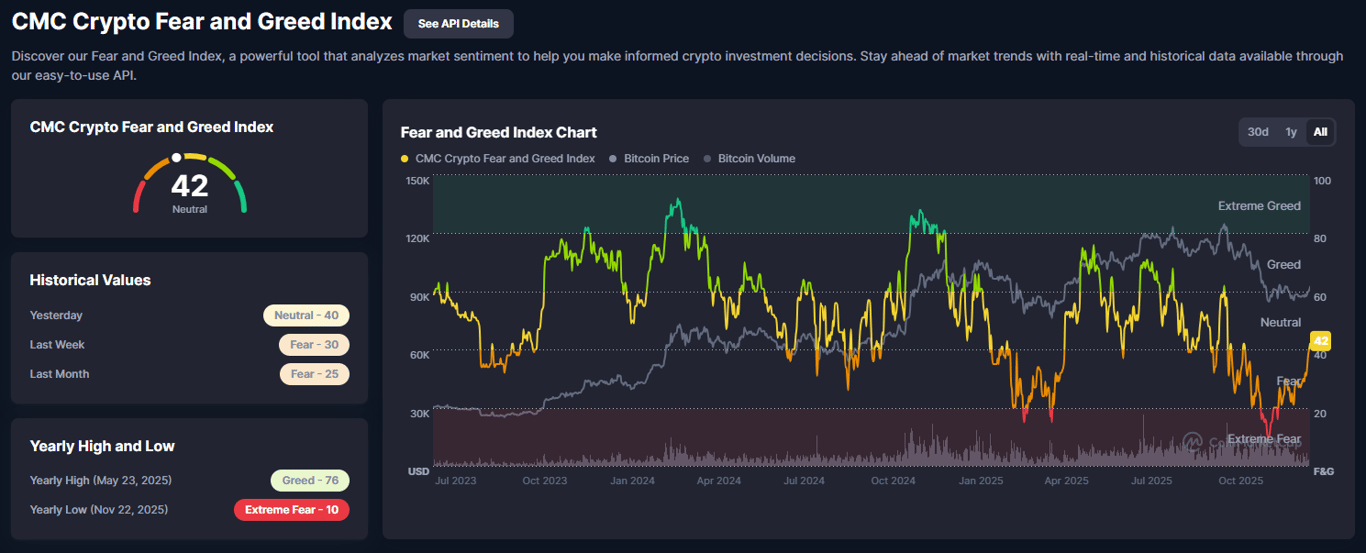 Image 2: The CMC Crypto Fear and Greed Index has climbed to 42, moving sentiment into Neutral territory after weeks stuck in the low 20–30 range. Recent readings show 40 yesterday, 30 last week, and roughly 25 last month. The yearly peak reached extreme greed at 76 in May 2025, while the deepest extreme fear printed at 10 in November. The overlay with Bitcoin price and volume highlights a familiar pattern: sentiment improves as price stabilizes and recovery gains traction.