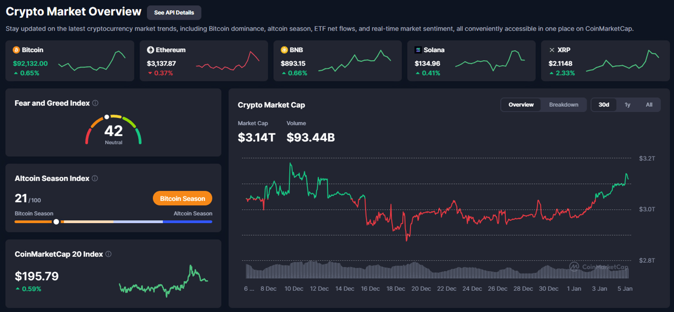 Crypto market first 2026 kicked off with clear momentum. Bitcoin broke higher toward $92,000, total market cap climbed to $3.14 trillion, and sentiment moved back to neutral. Fresh inflows, resilient price action, and steady regulatory progress signaled a stronger start compared to the slow close of 2025.