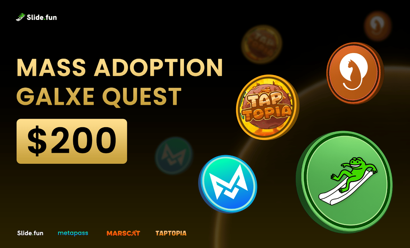 Slide.fun has partnered with MetaPass, MarsCat, and TapTopia to launch a collaborative community campaign Mass Adoption Quest aimed at introducing users to multiple Web3 ecosystems through a single quest.
