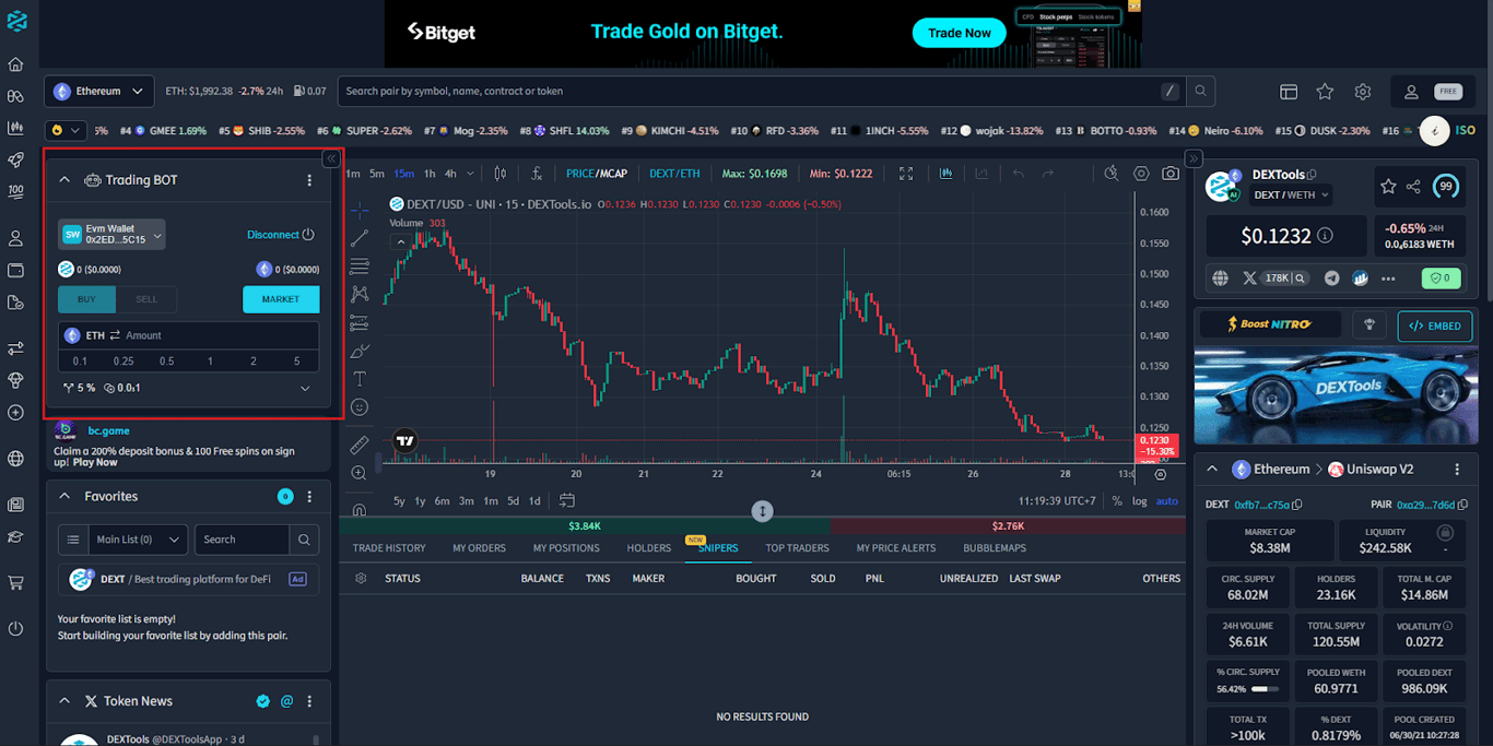 DEXTools simplifies this process by placing the Trading Bot directly inside the chart interface. Instead of switching tabs or tools, traders can execute positions exactly where they analyze price and liquidity.