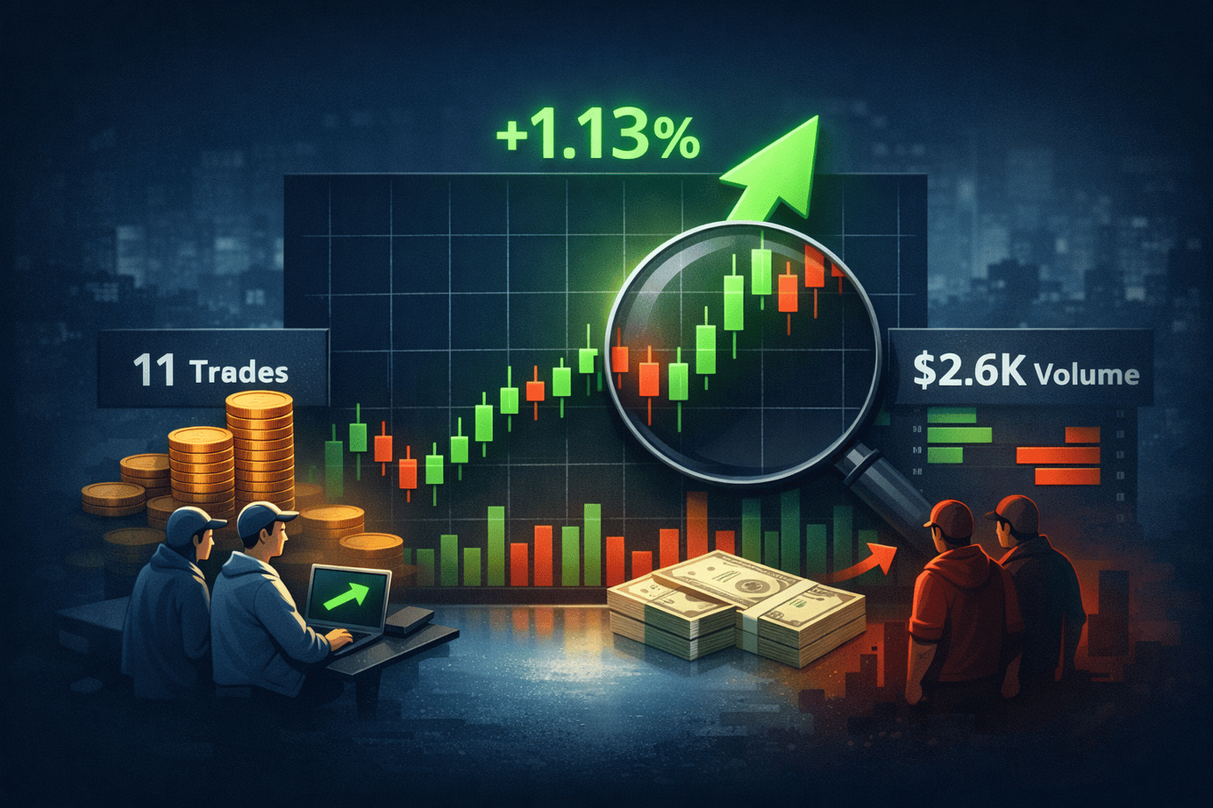 At first glance, a +1.13% move across 24 hours suggests steady progress. However, deeper inspection reveals a thin environment where only 11 trades and roughly $2.6K in volume drive the entire move, which shifts interpretation from strength toward imbalance.