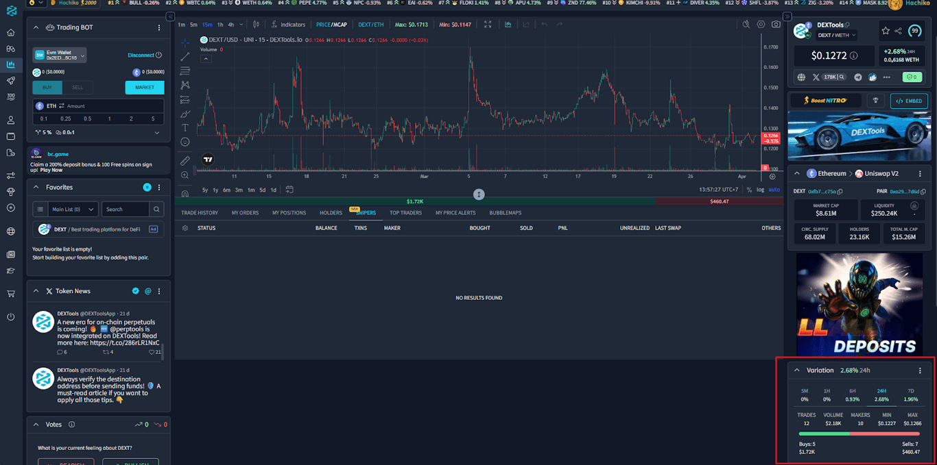 DEXTools brings these elements together within a unified workflow, where variation highlights price movement while volume and trades reveal participation patterns in real time.