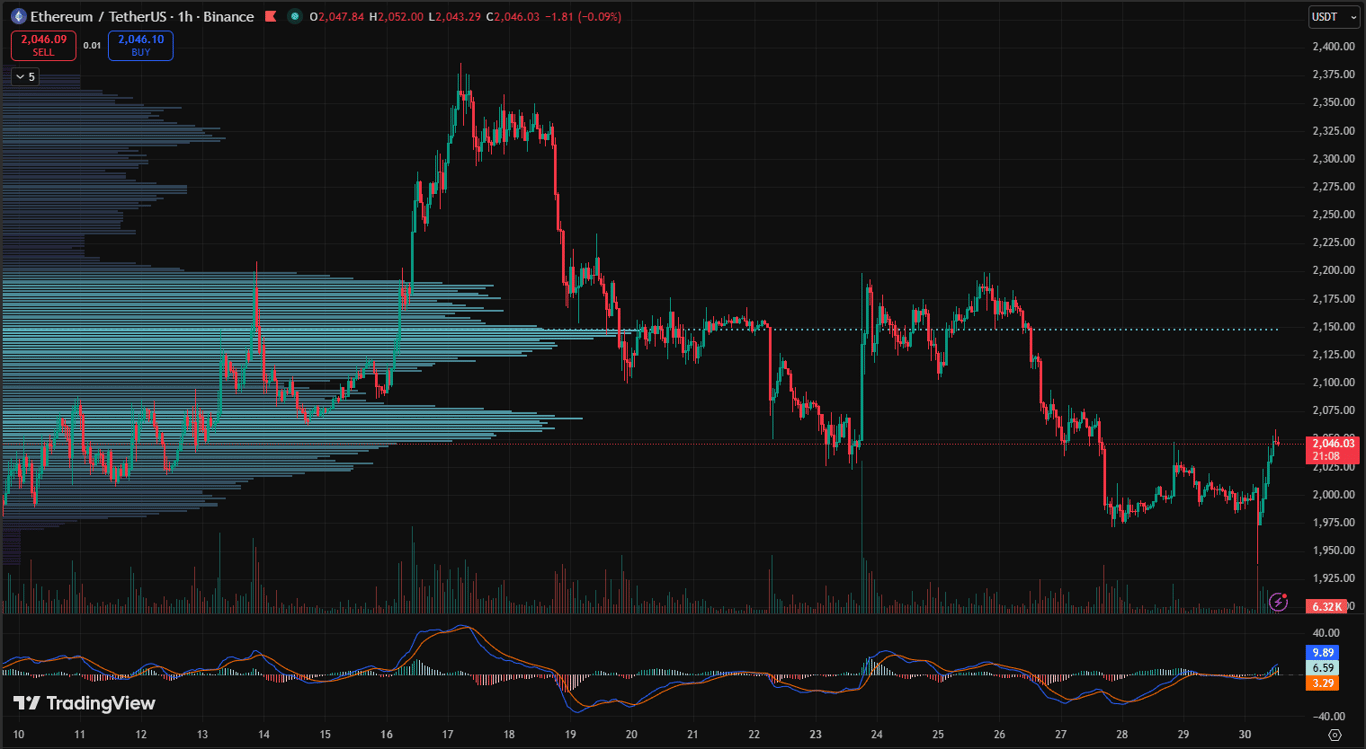 Current structure: bearish and highly correlated to Bitcoin, with parallel declines after failed rallies. Key levels centered on recent lows near $2,000 and resistance around $2,150. Market behavior included synchronized breakdowns followed by low-volume bounces. Indicator context highlighted compounded pressure from ETF outflows alongside macro flows. Bullish case: stabilization above $2,100 coupled with altcoin rotation signals. Bearish case: continued downside in line with broader risk-off moves. Bias stayed defensive. Interpretation: Ethereum faced dual headwinds from macro correlation and sector-specific institutional selling, limiting independent catalysts.