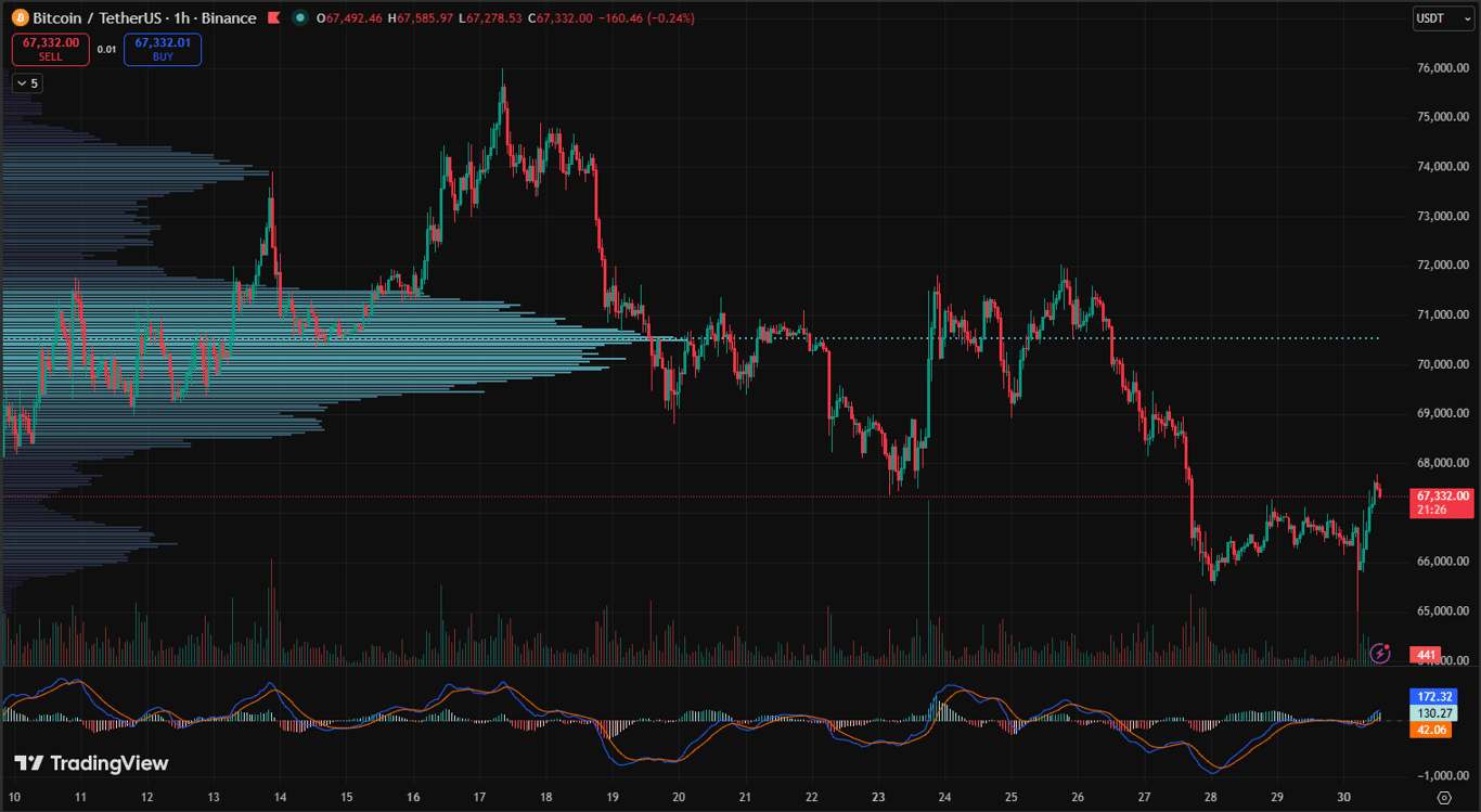 Current structure: short-term bearish following breakdown from mid-March consolidation near $70,000–$75,000 highs toward $65,000 support. Key levels included recent lows around $65,000 and overhead resistance at $70,000–$71,000. Market behavior featured sharp volume-driven selloffs mid-week before limited recovery attempts. Indicator context showed elevated selling pressure during declines, with hashrate adjustments adding supply-side nuance. Bullish case: sustained reclaim above $70,000 on increasing volume and de-escalation signals. Bearish case: breakdown below $65,000 amid prolonged oil/geopolitical stress. Bias remained defensive. Interpretation: price action primarily reflected macro risk repricing, with Bitcoin functioning as the market’s core barometer rather than exhibiting independent weakness.