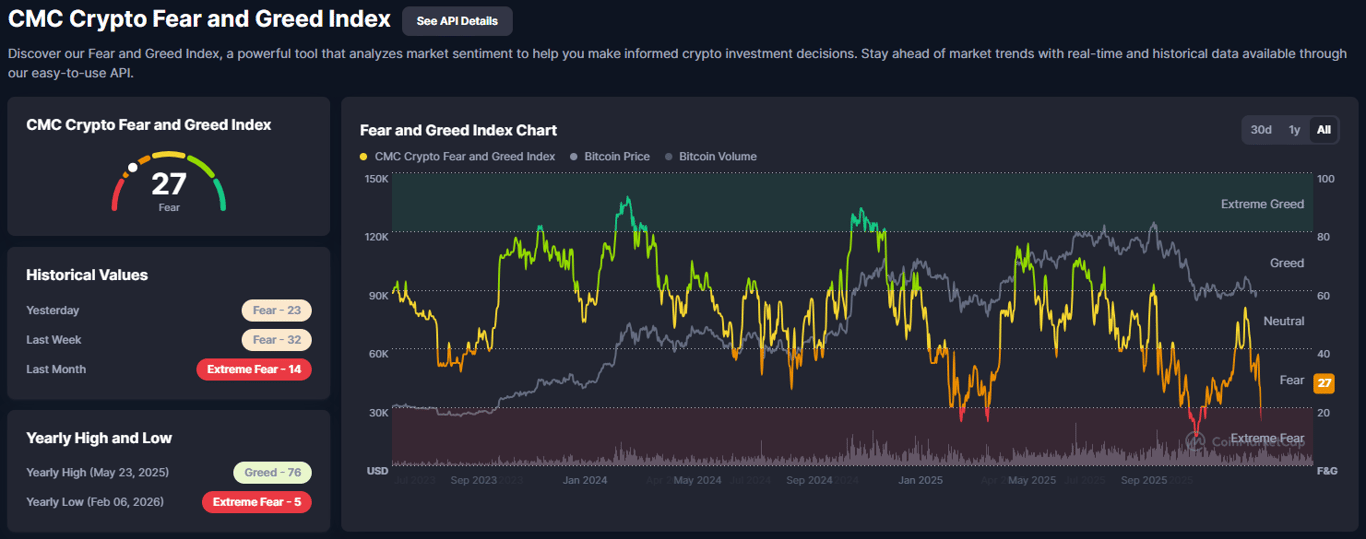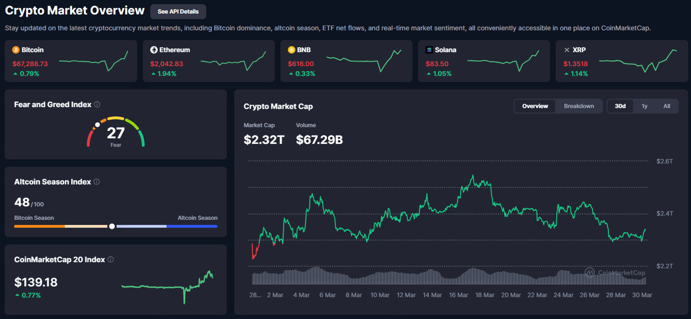 Total crypto market capitalization stood at $2.32 trillion with 24-hour trading volume of $67.29 billion as of the latest dashboard snapshot. The Fear & Greed Index registered 27, confirming sustained Fear sentiment consistent with investor caution over prolonged Middle East uncertainty and inflation repricing.