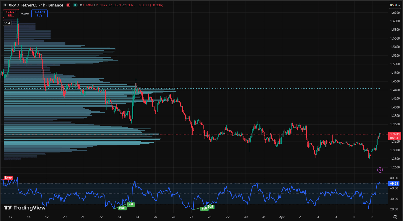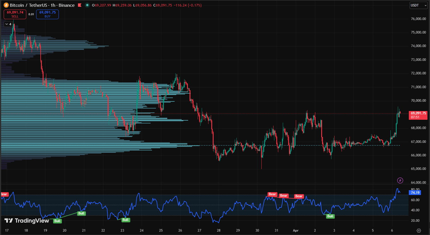 Short-term structure shifted to cautiously bullish after testing the $65,000–$66,000 support zone and staging a clear rebound to $69,000. Key levels: immediate resistance at $70,000–$71,000; support remains $67,000. One-hour charts displayed multiple Bull-labeled candles and volume expansion late-week, with RSI exiting oversold territory. Bullish case: sustained break above $70,000 on conviction volume amid oil stabilization. Bearish case: rejection and retest of $65,000 if geopolitical flares or hawkish Fed signals intensify. Bias: mildly bullish on the daily but macro-dependent. Interpretation: BTC functioned as the primary risk barometer, absorbing macro shocks before leading the recovery.