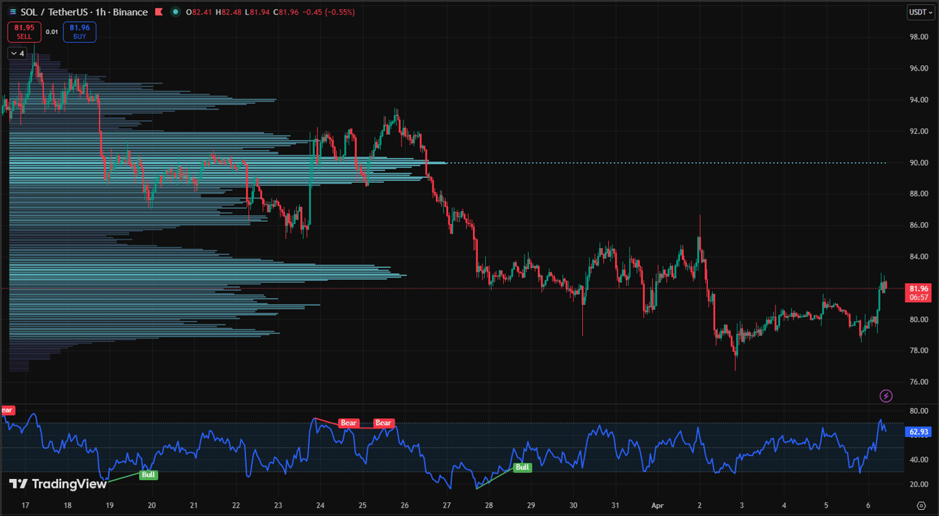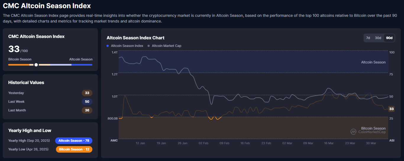 The Altcoin Season Index stood at 33/100—down from 50 the previous week—confirming persistent Bitcoin dominance and limited rotation into broader altcoins. The CoinMarketCap 20 Index reached $142.46 (+2.82%). Dashboard visuals on April 6 depicted upward-trending intraday lines for all tracked majors, while the 30-day market-cap chart confirmed the late-March trough and early-April recovery. These metrics collectively portray a market absorbing external shocks before exhibiting tentative resilience.