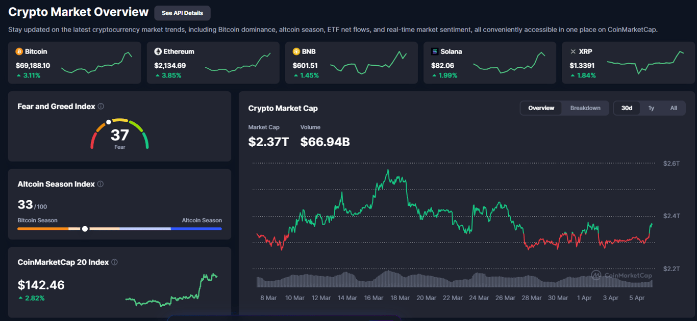 The period from March 30 to April 6, 2026, marked a transition from early-week pressure to late-week stabilization. Initial risk-off flows driven by oil spikes and Iran tensions compressed the total market capitalization toward $2.32T–$2.34T mid-period, with Bitcoin trading in the $66,000–$68,000 range amid mixed ETF activity. By April 6, a coordinated rebound emerged across major assets, lifting the market cap to $2.37T on $66.94B in 24-hour volume. Bitcoin posted a +3.11% daily gain to $69,188.10, Ethereum advanced +3.85% to $2,134.69, BNB rose +1.45% to $601.51, Solana gained +1.99% to $82.06, and XRP climbed +1.84% to $1.3391. The CoinMarketCap 20 Index increased 2.82% to $142.46, while the 30-day market-cap chart showed a clear bottoming pattern in late March followed by an upward inflection into early April. ETF flows remained uneven—occasional BTC and ETH inflows on select days offset by broader outflows earlier—reflecting institutional caution tied to macro uncertainty. Overall, the structure reflected a defensive bounce rather than a fundamental trend reversal, with price action tightly correlated to oil de-escalation hopes and bond-market signals.