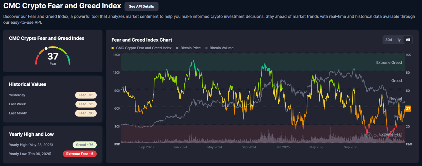 Total cryptocurrency market capitalization closed the week at $2.37 trillion, accompanied by 24-hour trading volume of $66.94 billion. The Fear & Greed Index registered 37 (Fear), an improvement from the prior week’s deeper pessimism yet still indicative of prevailing caution.