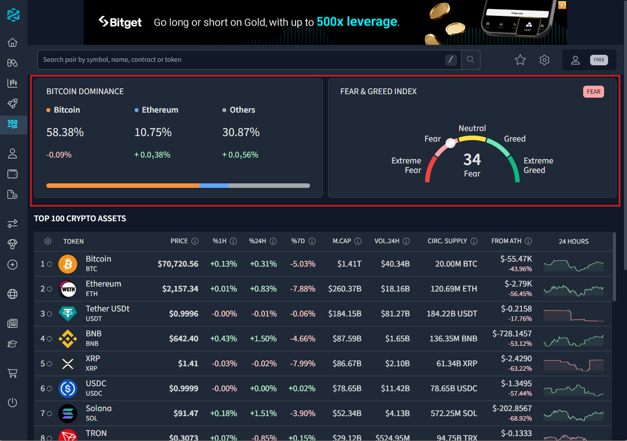 DEXTools integrates dominance and sentiment above the ranking layer, allowing traders to understand where capital sits before analyzing where it may move next.