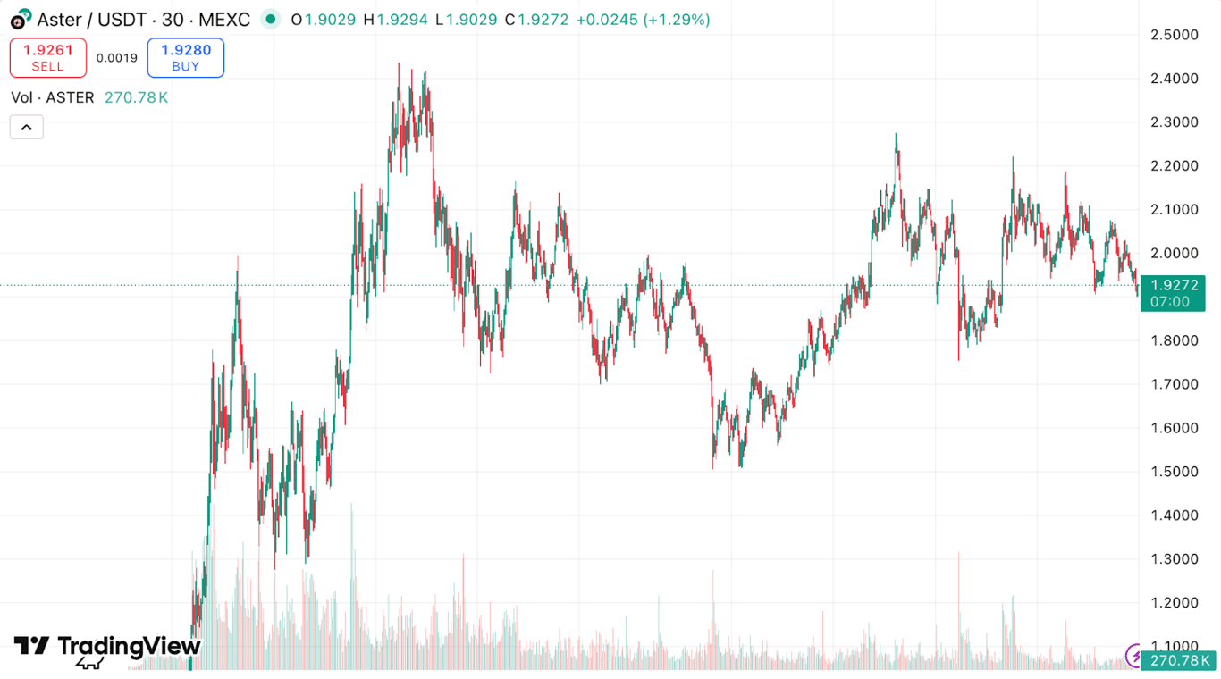 On September 17, 2025, Aster held its TGE (Token Generation Event). Within four days, ASTER surged from $0.08 to $1.97, delivering a 23x move. According to CCN.com, this ranked among the strongest DEX token debuts since Hyperliquid launched in 2024.