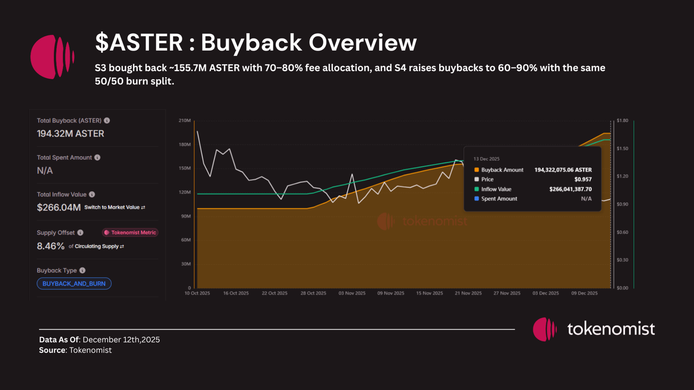 From a broader supply perspective, Tokenomist.ai reports circulating supply at approximately 31.7% of the total 8 billion ASTER, with the remaining allocation locked across ecosystem, treasury, and team vesting schedules.
