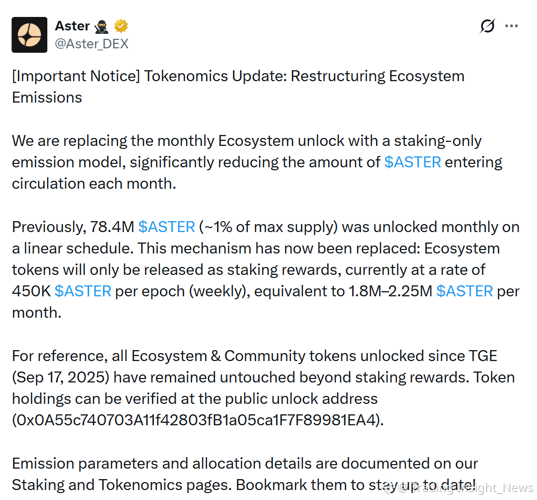 On March 30, Aster restructured its emission model, directly targeting the core source of sell pressure. The system replaces linear unlocks with staking-based distribution, reducing monthly emissions from 78.4M to 1.8–2.25M ASTER, a ~97% cut. Ecosystem tokens now enter circulation only through staking rewards, linking supply release to participation instead of time.